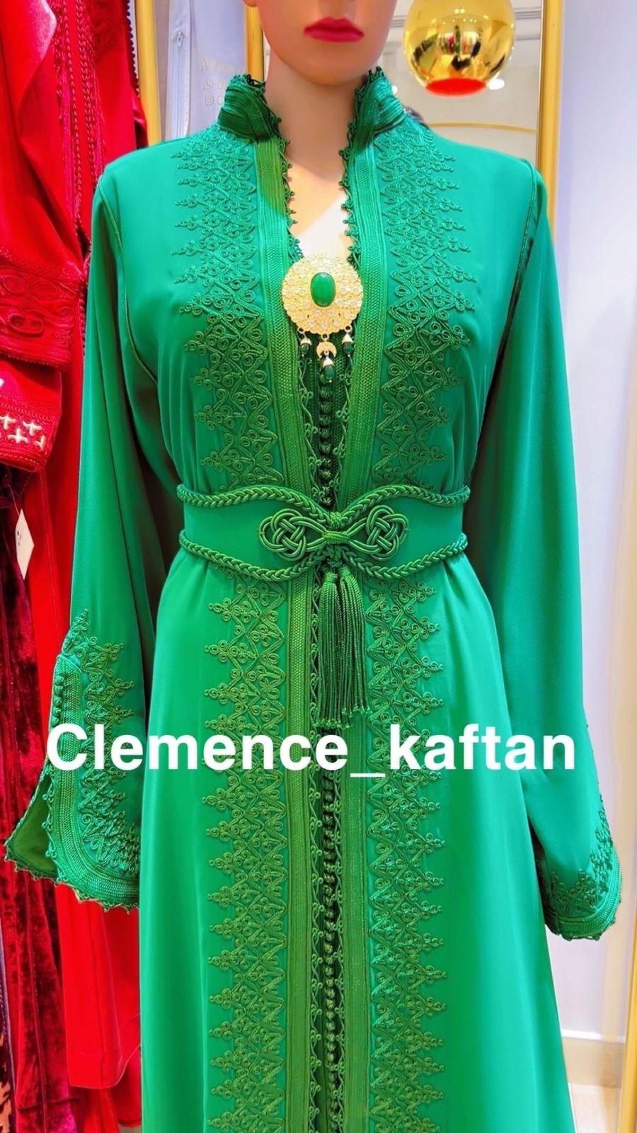 Radiate timeless beauty in this stunning emerald green Moroccan kaftan, crafted with exquisite embroidery and intricate detailing. The rich green fabric symbolizes grace and prosperity, while the elegant knotted belt perfectly accentuates the silhouette.