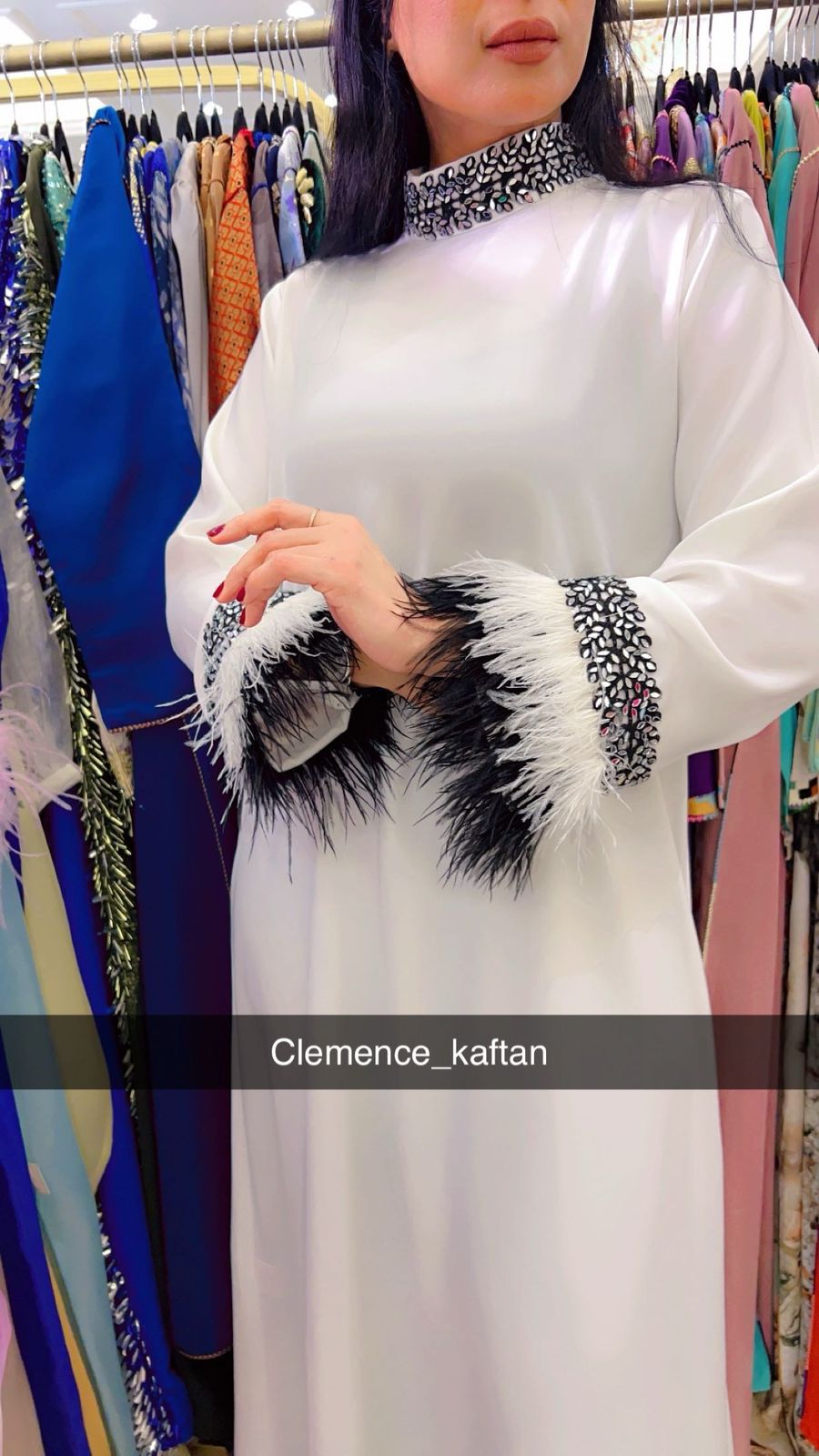 Effortless luxury in every detail. This white kaftan, adorned with intricate beadwork and bold feathered cuffs, is the perfect blend of modern chic and timeless sophistication.