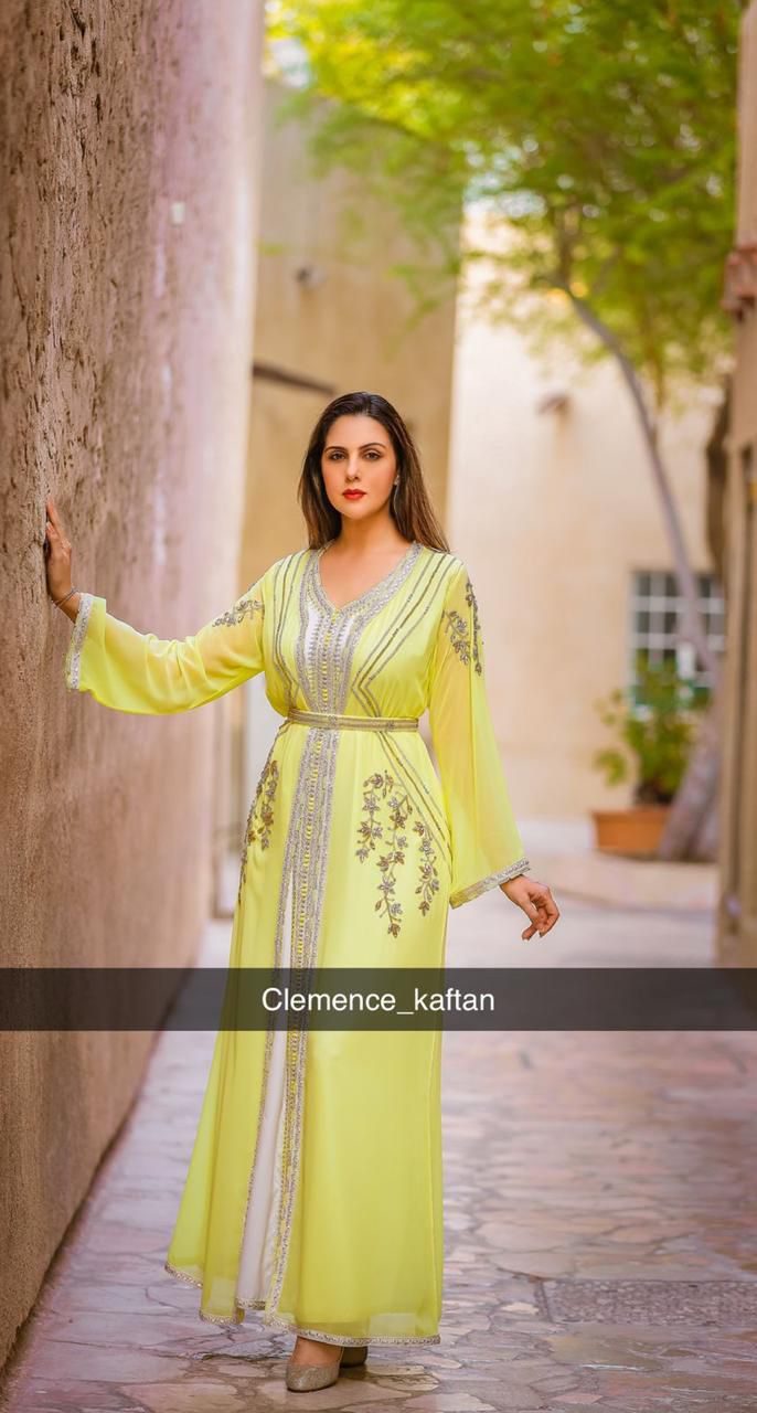 Glow with confidence in this radiant yellow Moroccan kaftan, beautifully embellished with silver embroidery and floral details.