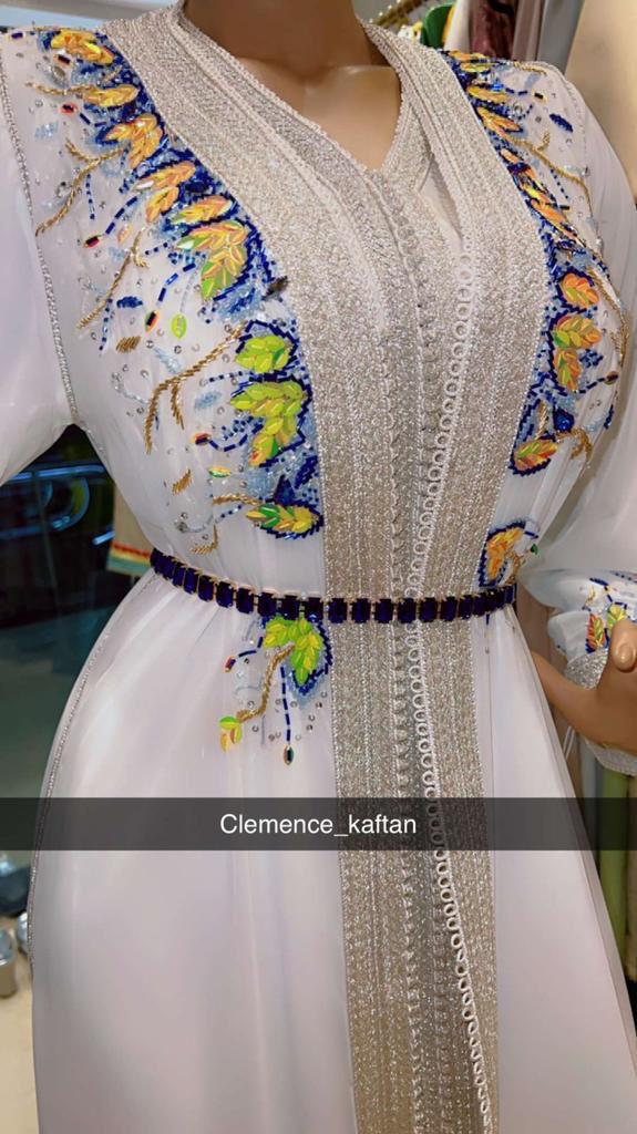 A vision of grace — this white Moroccan kaftan is adorned with vibrant floral embroidery, shimmering beadwork, and a delicately jeweled belt.